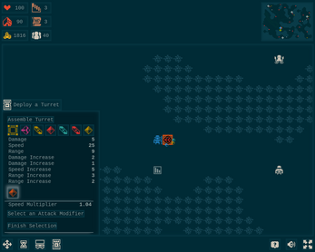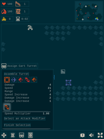 The cart dragging mechanic was interesting. I may have just missed it, but I didn't see any way to differentiate the turret bases or turrets while assembling a new one. Great work overall.